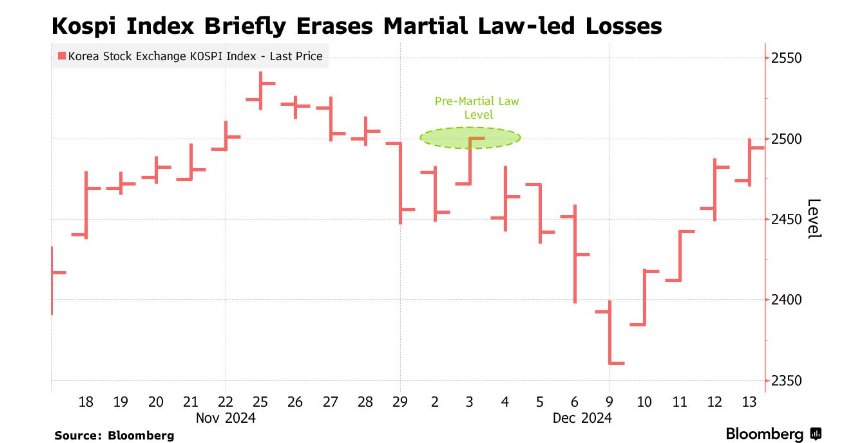 韩国股市基准指数周五攀升,从韩国总统尹锡悦“闹剧般”实践“韩国紧迫戒严令”所激发的扫数指数下降耗损中完结回应,复原戒严令以来的扫数跌幅。周五,韩国基准股指——Kospi综结伙价指数高涨0.5%,筹办四天高涨。该指数踯躅在12月3日收盘水平上方,其时尹锡悦在韩国技巧半夜倏得间文书紧迫戒严号令,战抖通盘韩国,韩国股债汇大幅走弱,然则尹锡悦几小时后便文书捣毁该戒严号令。